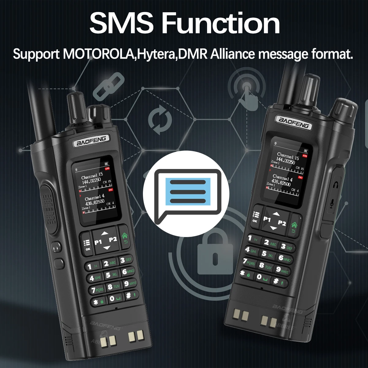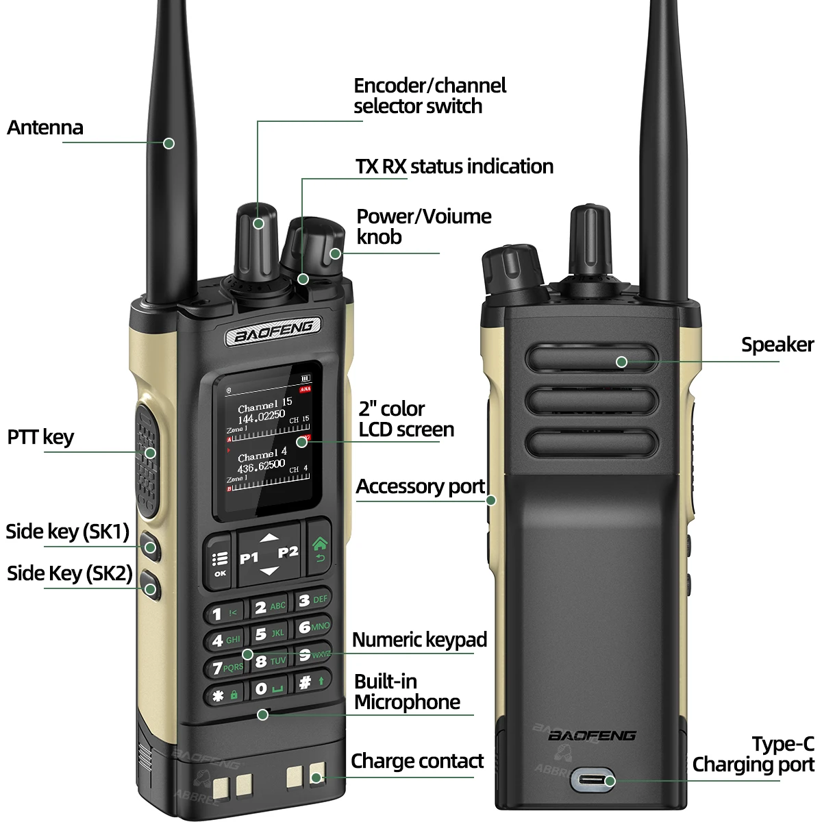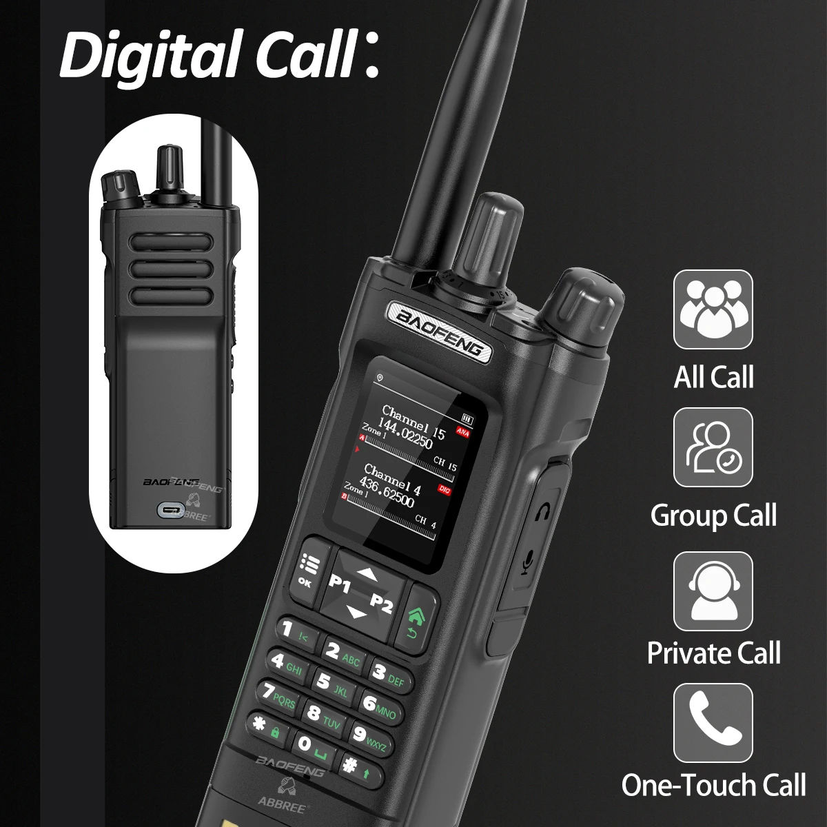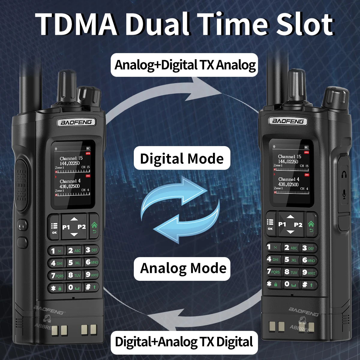 BAOFENG DM-32 digital walkie talkie with AM:108-136MHz,VHF:136-174MHz,UHF:400-470mHz, 4000 channels, dual mode (digital, analog) .Direct mode dual slot communication achieves two groups of calls at a frequency point at the same time so that the communication efficiency is doubled and frequency resources are saved.