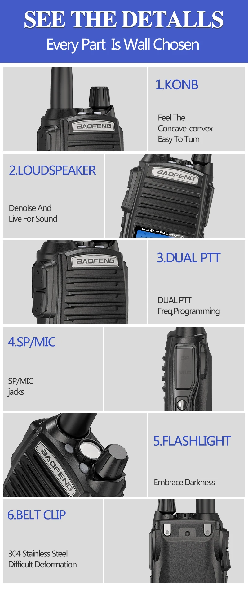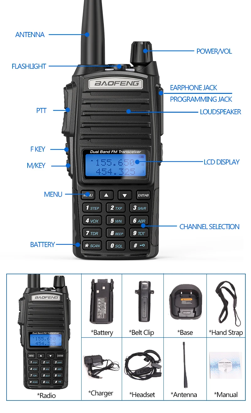 High / / Low Power Settings; Frequency Range: 65-108 MHz(Only commercial FM radio reception) VHF: 136-174 MHz(Rx/Tx). UHF: 400-520 MHz(Rx/Tx). Broad (Wide) / Narrowband (Narrow) Selectable Dual-band handheld transceiver with display function menu on the display “LCD”. Function Busy Channel Lock “BCLO”.