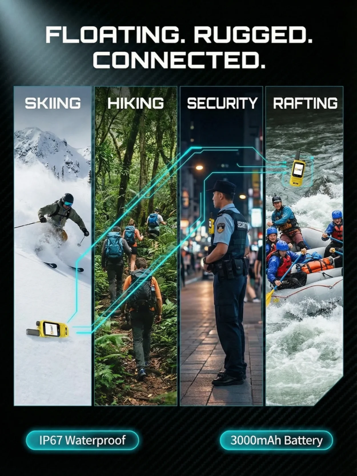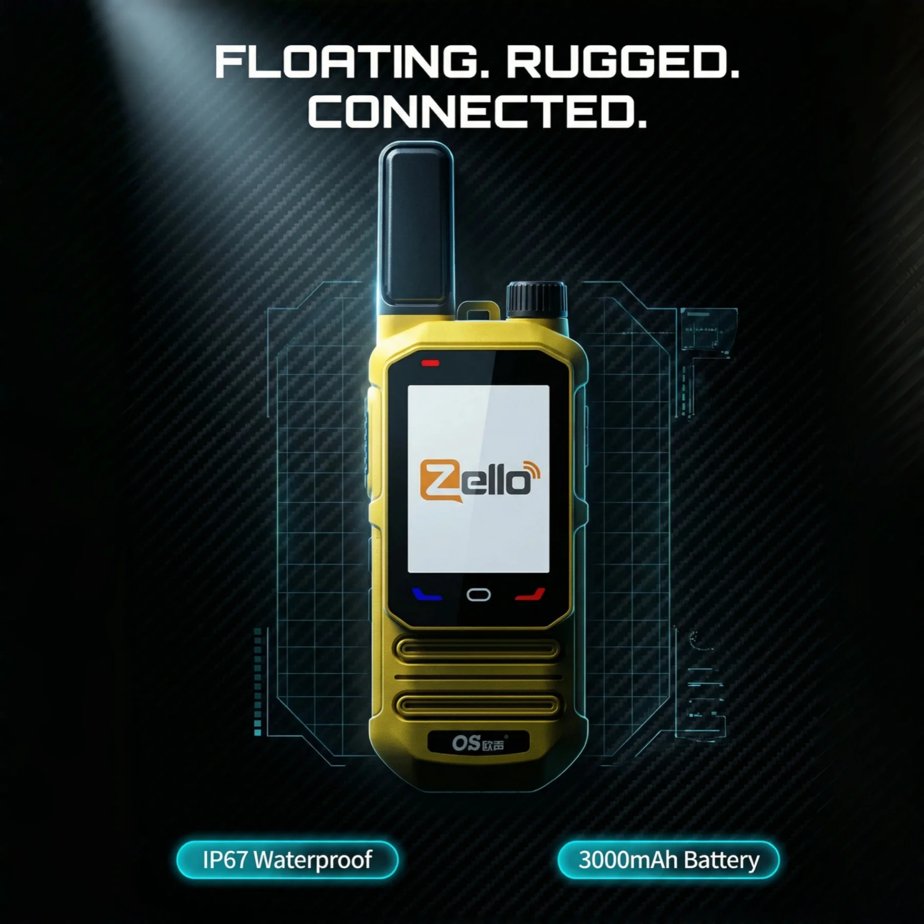 Rugged IP67 waterproof and floating 4G PoC walkie talkie with built‑in GPS and Bluetooth. Zello‑ready handheld radio for unlimited push‑to‑talk communication over 4G, ideal for outdoor camping, hiking, fishing, marine use, security teams, and factory operations.