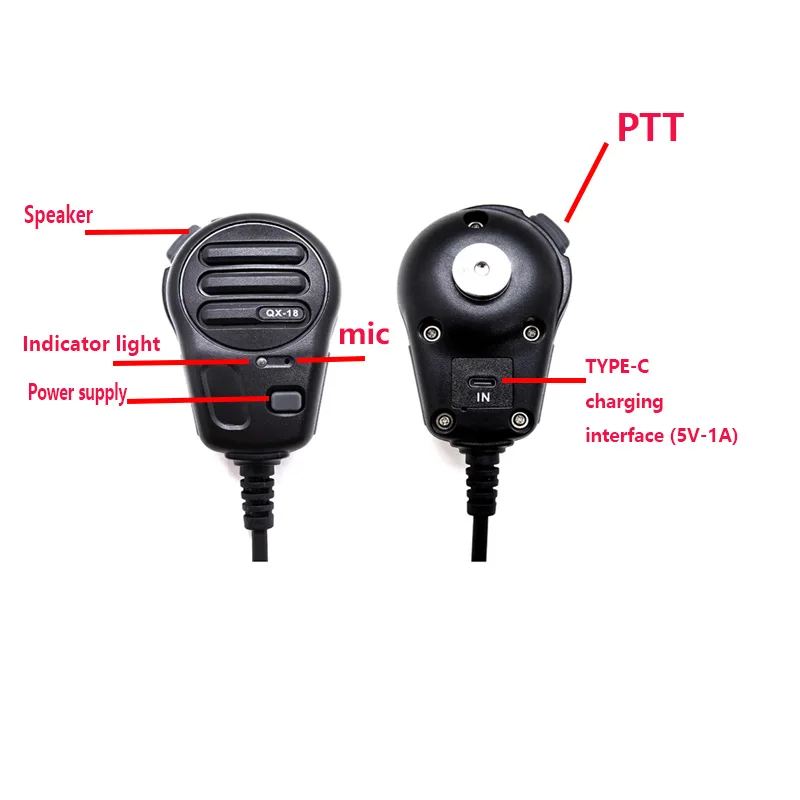 The QX18 is an active handheld shoulder speaker microphone designed for mobile phones running the Zello Walkie Talkie App. It features a built‑in battery (Type‑C charging), LED status indicators, and a dedicated PTT button for fast, clear communication.