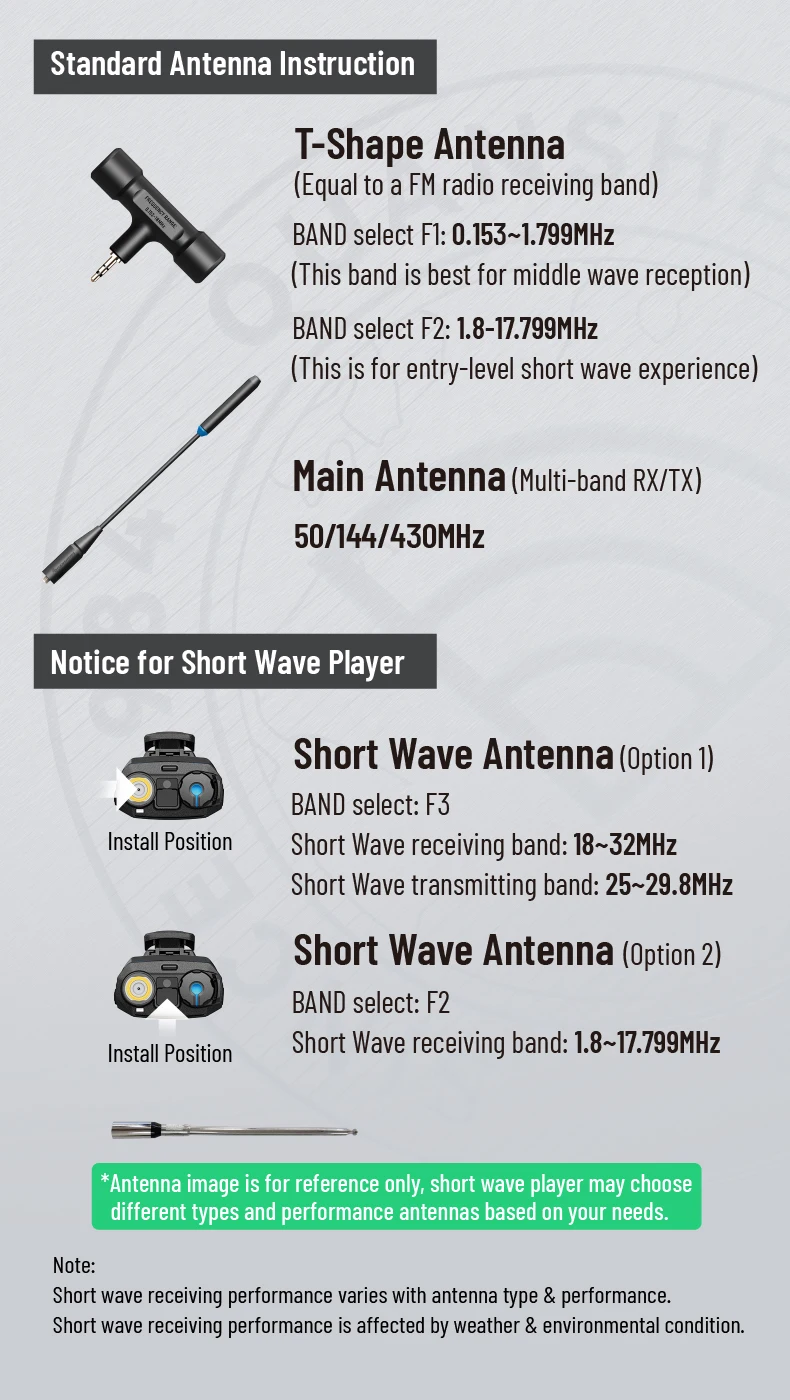 High-Gain Antenna (50/144/430MHz) + T-Shape Antenna (0.153–18MHz)