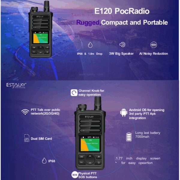 Estalky E120 Push-to-Talk over Cellular (PoC) radio presents a simple yet powerful radio designed to help business users communicate effortlessly and efficiently.  The compact body, one-handed operation is smooth and free, and the 7000mAh battery guarantees long-term working needs.. Built-in high-power 3W speakers and add AI noisy reduction chipset, no pressure for push to talk communication in noisy environments. it built witih gps, wifi, bt function to achieve fine scheduling of front-line personnel, meet the requirements of IP68 protection level, and be free from harsh environments.
