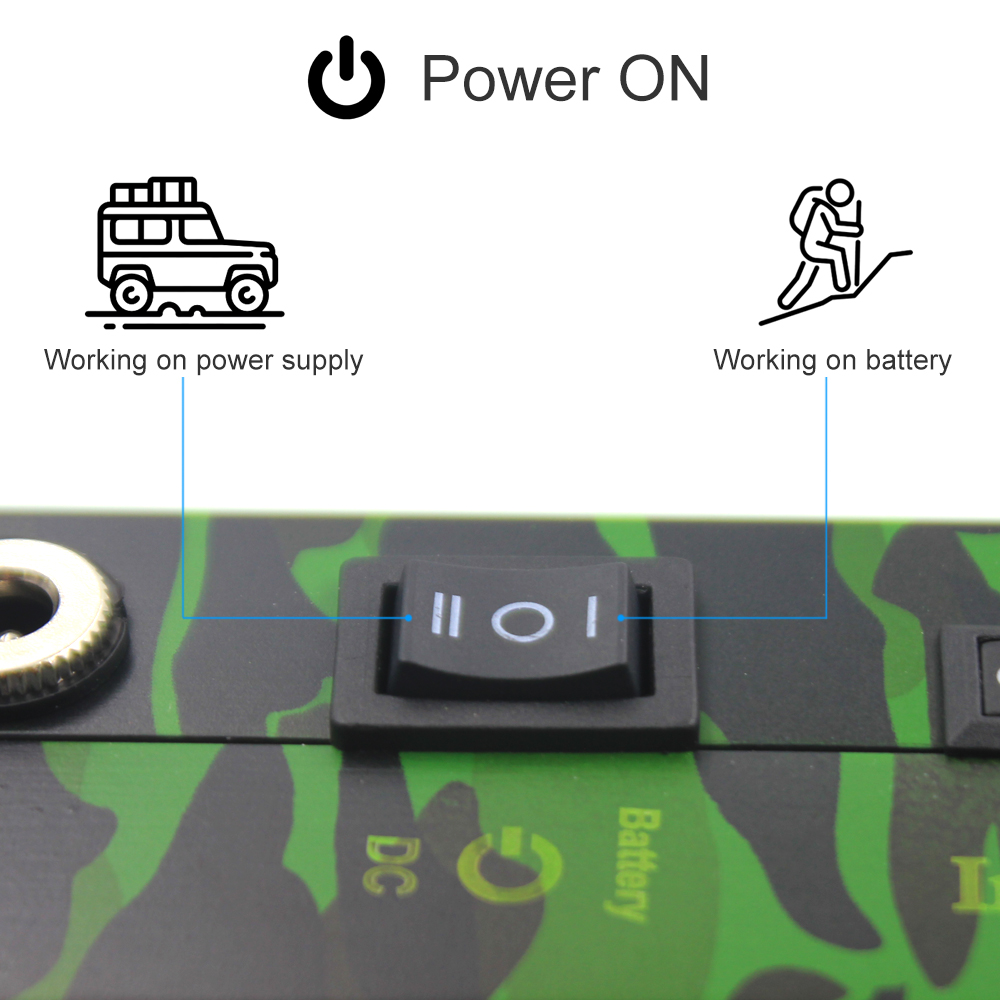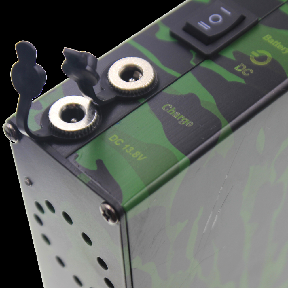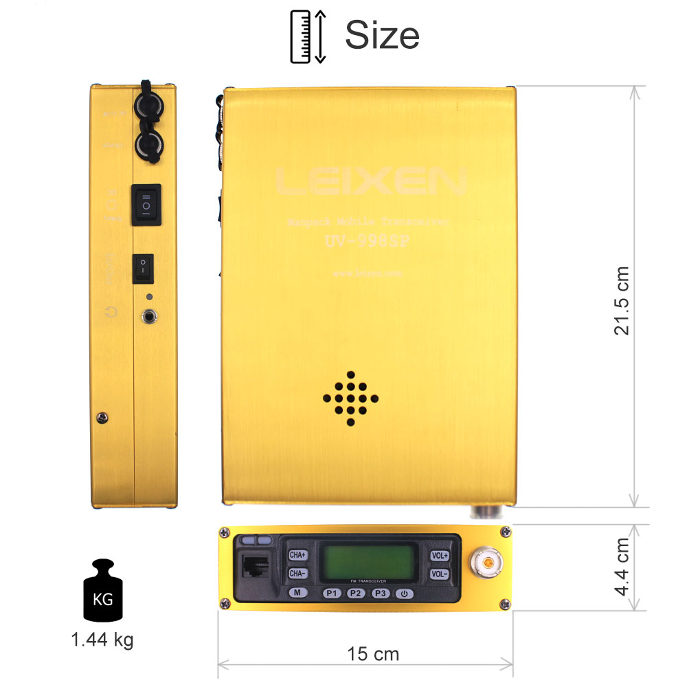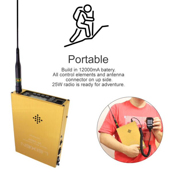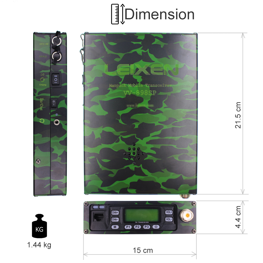 Built-in: VV-898SP 25W mobile transceiver, 12A Li-ion battery, radiator fan, earphone connector.