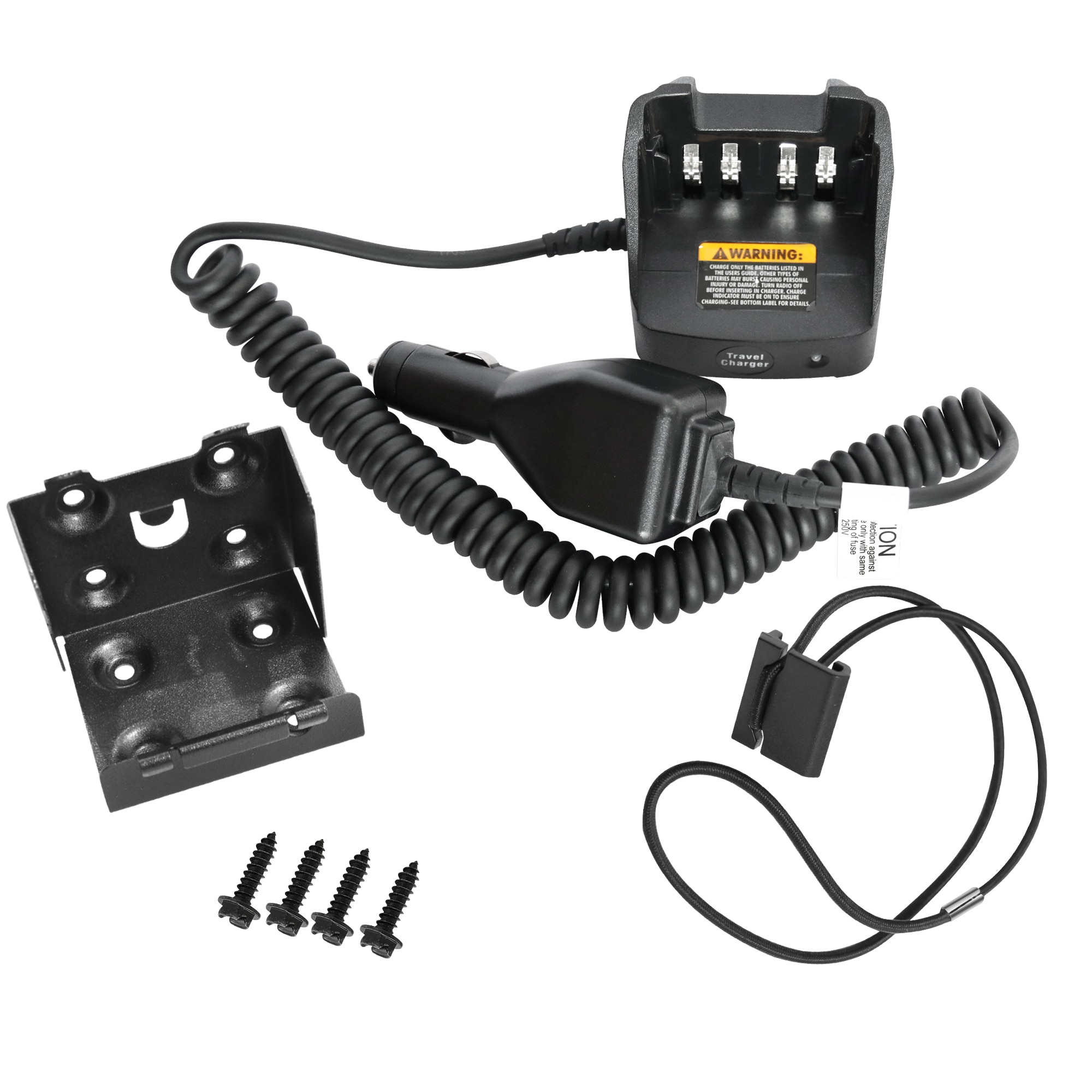 • Unit includes voltage regulated vehicular charger adapter, custom charger base, mounting bracket, and coil cord.