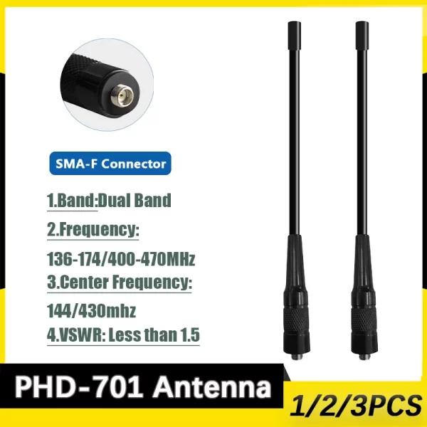The PHD-701 VHF/UHF Dual Band Antenna is a must-have accessory for any handheld radio user looking to extend their communication range. Designed for versatility, this antenna is compatible with a wide range of devices, including the Kenwood TK-360, TK-370, and TK-372 series, as well as the Baofeng UV-5R, UV-5RA, and UV-5RB models. Its robust SMA-F (Female) connector ensures a secure fit, while the antenna’s 2dBi gain and 20 Watts max power handling capability make it an ideal choice for both indoor and outdoor use.