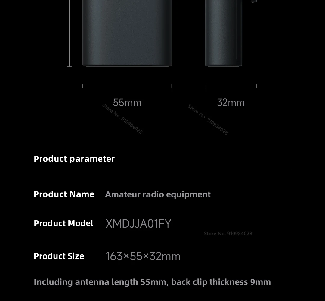 Product size: 163x55x32mm (including antenna length of 55mm and back clip thickness of 9mm)